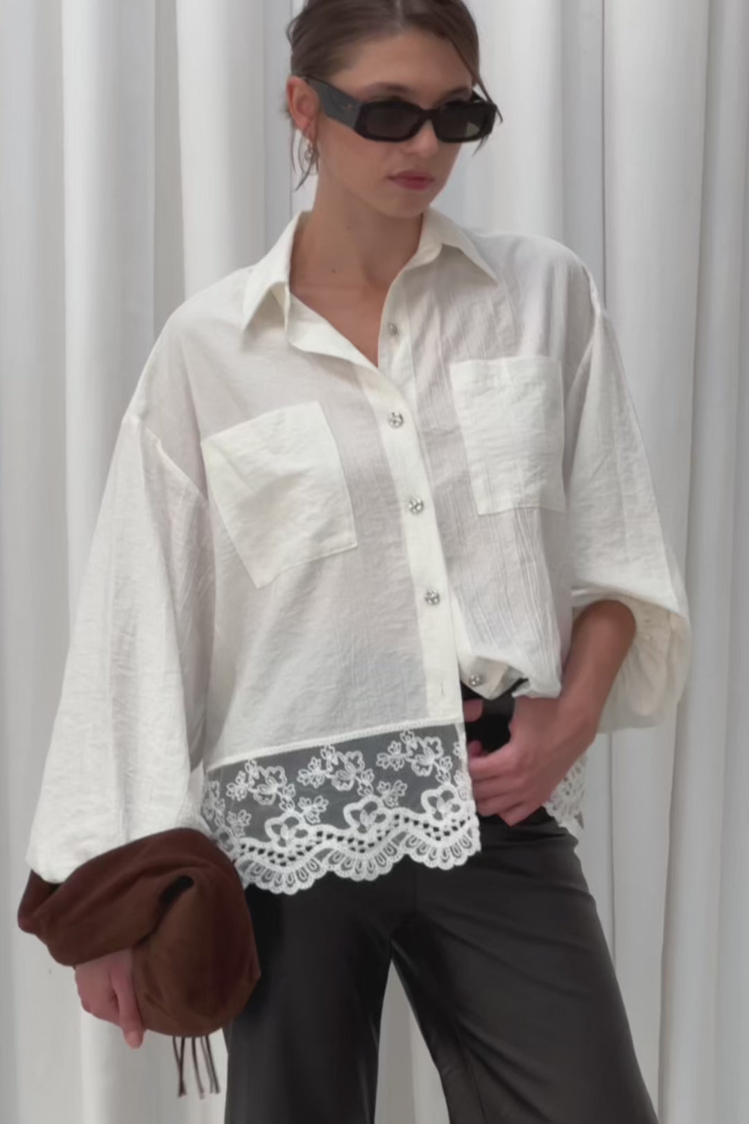 The Abril blouse in white texture is a refined wedding guest top featuring delicate lace hem detailing for a feminine touch. This versatile textured blouse creates visual interest while maintaining sophisticated elegance—dress it up for wedding events with tailored pieces or style it casually with denim for garden parties. A sophisticated occasionwear essential perfect for spring and summer celebrations.